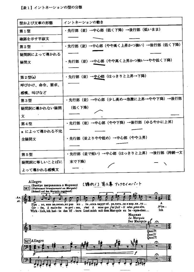 さて、アクセントが単語のレベルである波を作るとしたら、イントネーションは文あるいは単語の連なりのレベルで波を作り出すものだといえる。プロコフィエフは、テキストに音楽をつける際に、ロシア語のイントネーションにも留意している。なお、ロシア語のイントネーションは中心部を持つという特徴がある。この中心部とは、文あるいはフレーズにおいて発話者が強勢を置く語のアクセント部分に位置し、固定していない。そして、この中心部をめぐって波が作り出され、その際には特に声の高さの変化が重要となる。また、ロシア語のイントネーションは、文章の形態の違いなどから一般に5つの型に分けることができる【表1】(注3)。これらのことを踏まえた上で、声楽パートの旋律を見ていきたい。【譜例4】は、アレクセイとポリーナの対話の場面である。上から逐語訳、テキスト、イントネーションの動きを示すしるしとイントネーションの型の分類、声楽パートの旋律と付随するテキストを一緒に示してある。