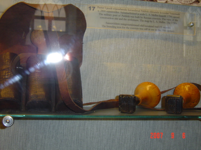 のっぽのヘルマン エストニア国立博物館内にある懲罰用印 7日(金)、晴れのち曇り。7時47分発の郊外電車でパルディスキ市へ出発。切符は車内で購入(片道20クローネ)。車窓から森や草原などエストニアのさまざまな姿を垣間見ることができる。8時57分着。駅舎はなくプラット・ホームの「パルディスキ」という看板のみ。駅傍にある売店のおばさんに「サラヴァト・ユラーエフの像」と「郷土史博物館」の所在地を聞く。ロシア語が通じるのがパルディスキ市らしい。ここは1962〜94年まで旧ソ連最大の施設を持つ原子力潜水艦の訓練基地として基地所属の原子炉2基を持ち、約1万6000人を雇用するいわゆる「閉鎖都市」であった。ソ連崩壊後の1995年、ロシア連邦は原子炉施設の管理を放棄し、そのため多くのロシア人は本国へ戻ったが、この地に留まったロシア人もかなりの数に上るという。現在、約4000人が暮らしている。後に知己を得た「郷土史博物館」の「番人」氏はそうした軍人の一人であった。