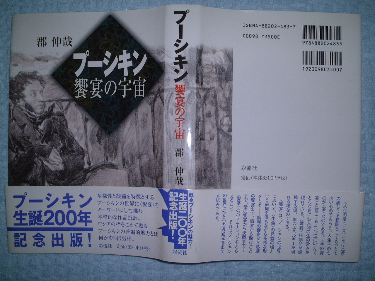 しかし作品に即さずに抽象的に語っているだけでは、書く方も読む方も、もどかしさを感じます。実際にプーシキンの作品を読んでいただくしかありません。そこで最後に、プーシキンを翻訳で読んでみようという人のためにひとこと。まずプーシキンの日本語訳でもっともまとまったものは、「プーシキン全集」(全6巻、河出書房新社)です。また各種の世界文学全集や文庫本にも、抒情詩、短篇小説、韻文小説『エヴゲーニー・オネーギン』、戯曲『ボリス・ゴドゥノフ』などの作品が入っています。そのうち現在購入できるものは残念ながらわずかなので、図書館などで借りて読んでください。(なお、この11月に出した拙著『プーシキン――饗宴の宇宙』(彩流社、3500円)のなかにも、詩の翻訳や「小さな悲劇」の詳しい紹介などが含まれています。)