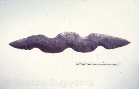 Las ofrendas encontradas en los complejos de enterramiento de la Pirámide de la Luna presentan una gran variedad. Abundantes consistieron en piezas de obsidiana; entre ellas destacan cuchillos, figuras humanas (foto arriba) y una pieza, llamada "excéntrico ondulante" (foto abajo), realizada en obsidiana mecca (negra con vetas rojas). Se cree que la forma de esta pieza tiene relación con el rayo del dios Tlaloc. |