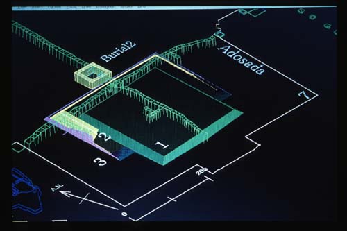 月のピラミッドは、石や日干しレンガ、土が内部に詰められた頑丈な建造物である。月のピラミッドのトンネルの発掘は、地元の経験豊かな労働者たちの努力によって実現してきた。彼らは先端の尖った鉄の棒や、つるはし、ピラミッドの埋め土を取り除くために特別にあつらえた太めの鉄筋を利用する。そして発掘してできる新しい空間を確保するため、約50cm〜1mごとに埋め土を止めるための天井として木の枠組みを備え付ける。すべての建築上の情報や、私たちが建てた木の柱の位置は以下に示すような3次元の地図を作るためにトータルステーションで記録されている。 |